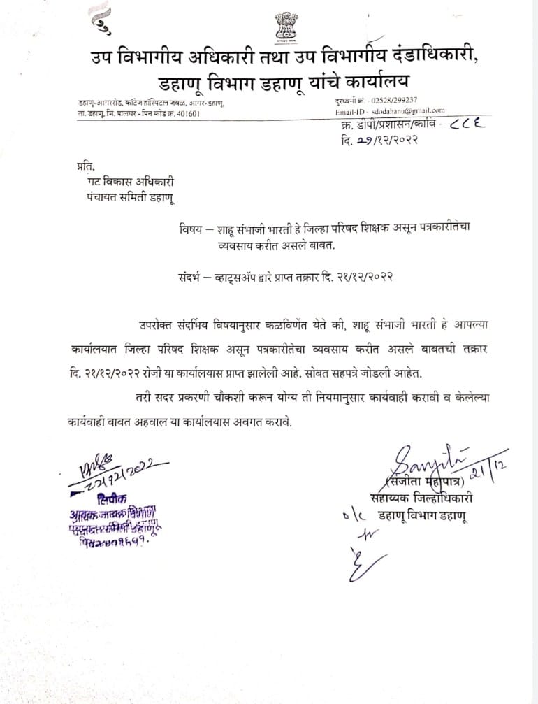 पालघर: जिल्हा परिषदेचे शिक्षक असतानाही अनधिकृतरित्या डिजिटल दैनिक चालवत संपादक बनलेल्या शाहू भारती यांच्या ‘प्रतापाची’ दखल घेऊन उपविभागीय अधिकारी संजीता मोहपात्रा यांनी डहाणू पंचायत समितीच्या गटविकास अधिकाऱ्यांना चौकशीचे निर्देश दिले आहेत. याच दरम्यान, जिल्हा परिषद अध्यक्ष प्रकाश निकम यांनीही कठोर पाऊले उचलण्याचे संकेत दिले आहेत.